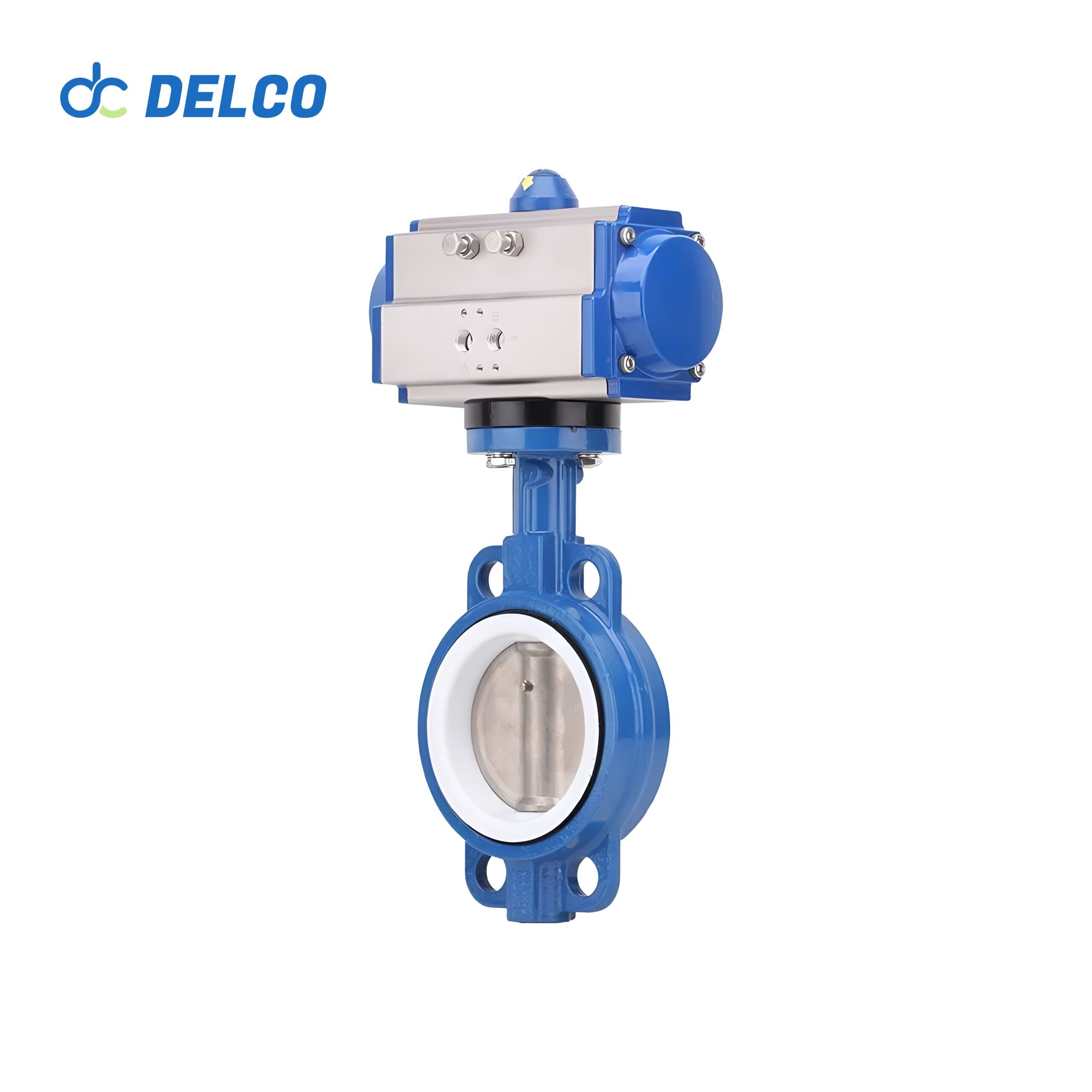 DELCO Pneumatic Wafer Type Butterfly Valve is a versatile valve designed for precise fluid control. It features a double acting standard control mode, with the option for single acting operation. Constructed with either cast iron or ductile iron body, and optional 304 or 316 stainless steel materials, this valve ensures durability and compatibility with various applications.