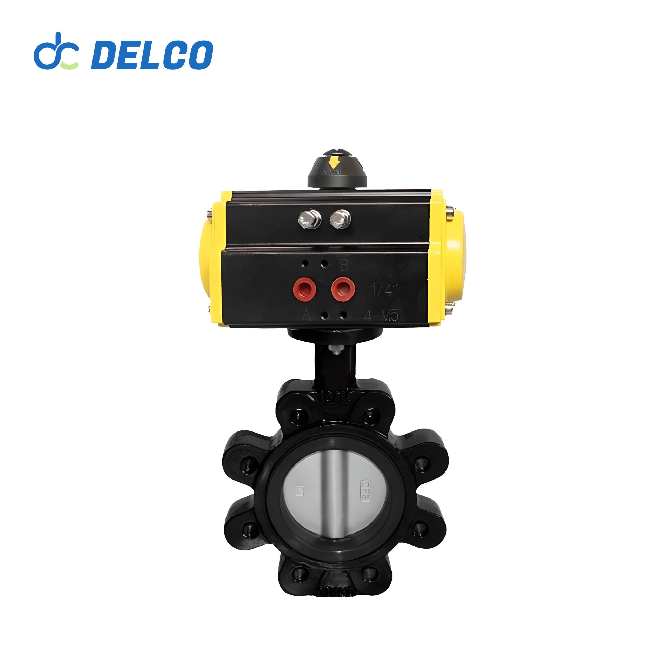 DELCO DK67-LB 氣動凸耳式蝶閥採用耐用的鑄鐵閥體結構,提供可靠的流體控制。它採用雙作用標準控制模式運行,也可根據要求提供單作用模式。輸入氣壓範圍為 2.5 至 8 bar,並具有最小 2 英吋的凸耳連接,可確保靈活性和與管道系統的牢固連接。
